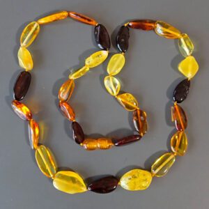 Колието е ръчно изработено от естествен, полиран, Балтийски кехлибар. Цвят коняк и мляко. Камъните на колието са 100% кръгли, наредени едно до друго. Закопчалката е винт. Дължина 45см.